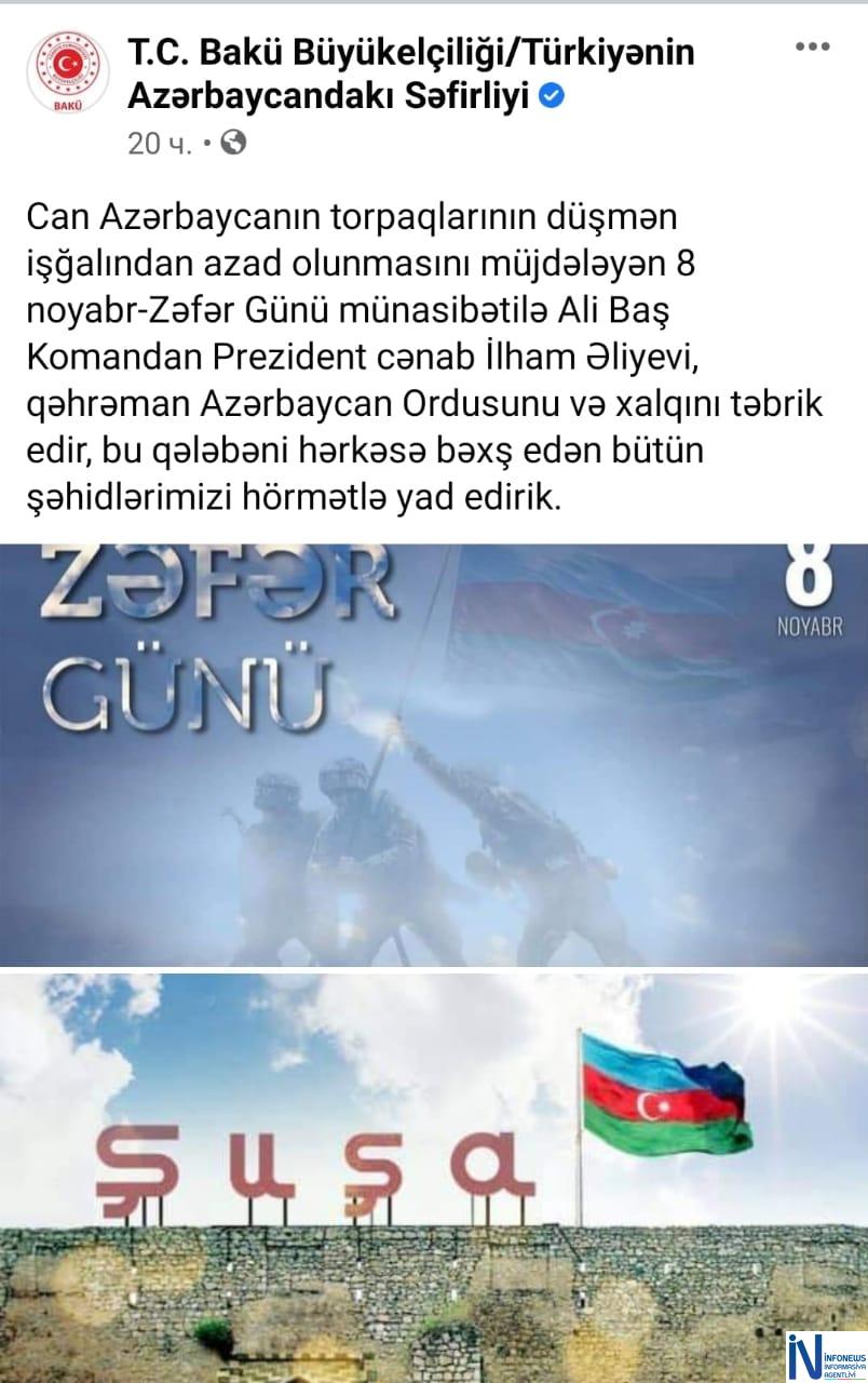 Türkiyənin Azərbaycandakı səfirliyi 8 Noyabr – Zəfər Günü ilə əlaqədar “Facebook” səhifəsində paylaşım edib.
